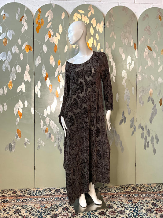 Vintage 1990s Linda Lundström Grey Brown Burnout Velvet One Sleeve Maxi Dress, O/S