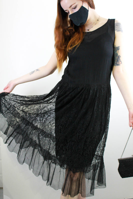 Vintage 1920s Sheer Silk Chiffon and Lace Dress, Small