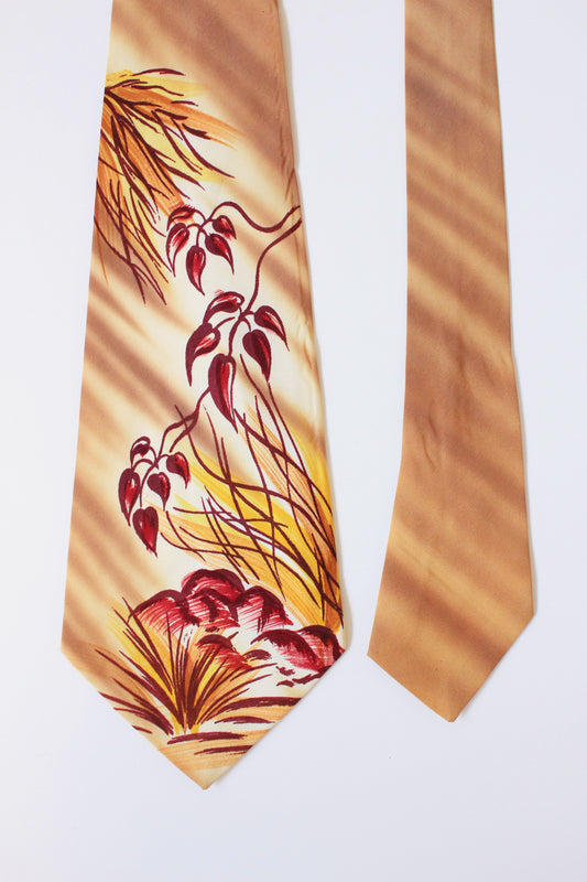 Vintage 1940s Warm Toned Leaf Print Rayon Summer Tie