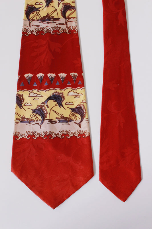 Vintage 1940s Red And Yellow Swordfish Rayon Tie, Mid Century Summer Tie