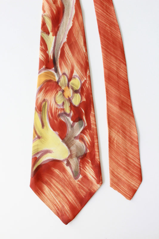 Vintage 1940s Mid Century Hand Painted Orange Tie With Yellow Flowers