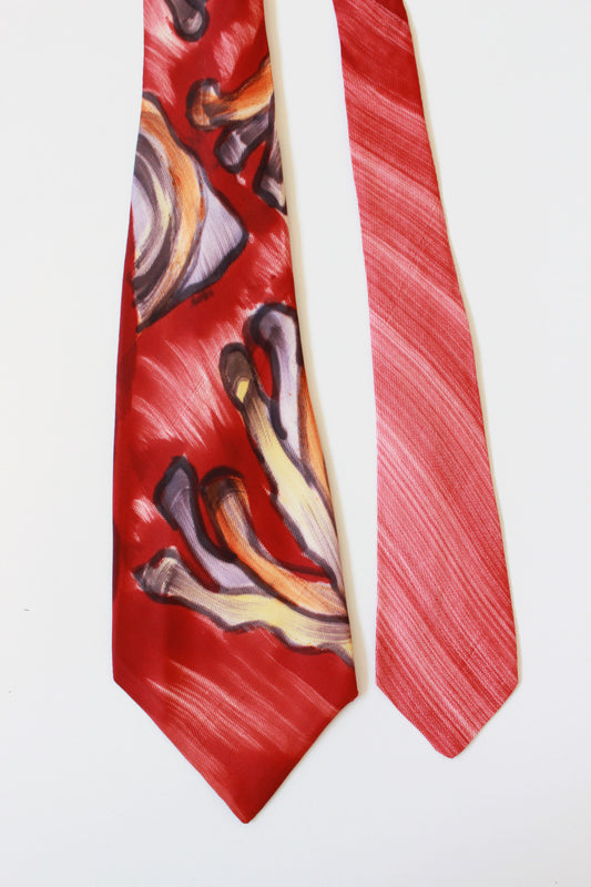 Vintage 1940s Abstract Red And Yellow Hand Painted Rayon Tie