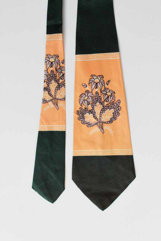 1940s Dark Green Floral Bouquet Print Rayon Necktie