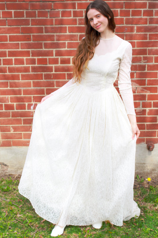 Vintage 1950s White Lace Long-Sleeve Wedding Dress, Small