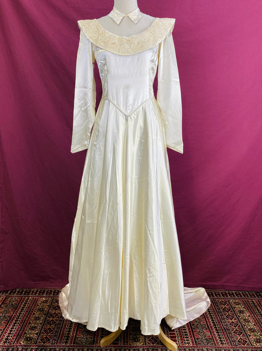Vintage 1950s Liquid Satin Long-Sleeve Wedding Dress with Embroidered Collar, B34