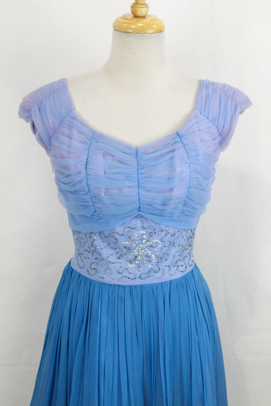 Vintage 1950s Blue and Lilac Chiffon Party Dress, Sequinned/Beaded Waist, Small