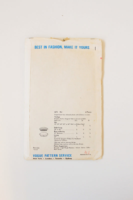 1960s Draped Beret Hat Vogue 6675 Sewing Pattern, Sally Vielon , Cut-Complete Size 22