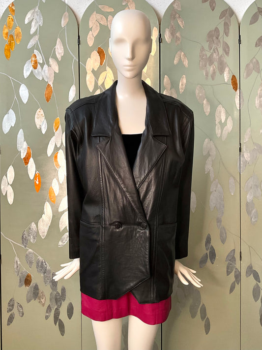 Vintage 1980s Black Leather Double Breast Blazer, Medium