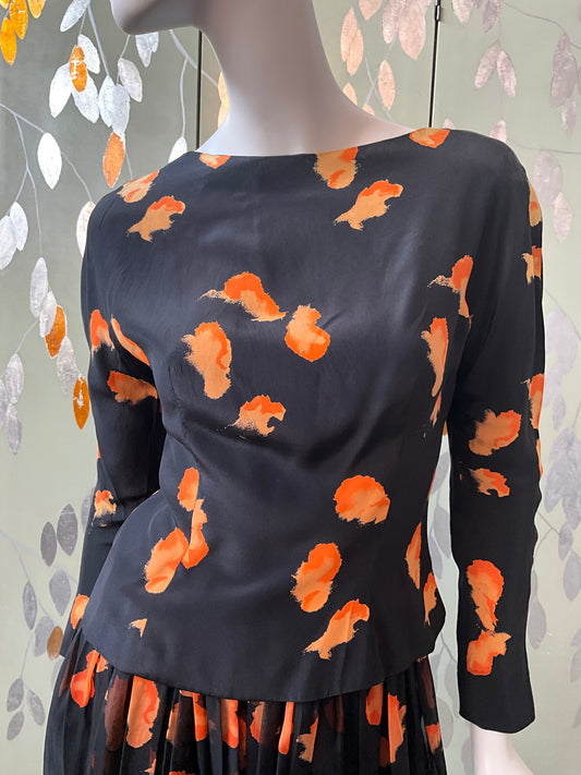 Vintage 1980s/90s Black & Orange Silk Open-Back Blouse & Skirt Set, Small