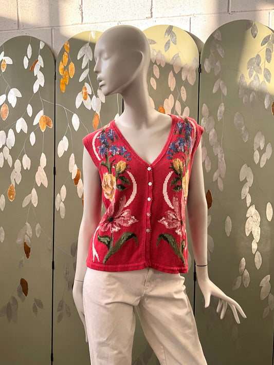 Vintage 1990s Pink Floral Sweater Vest, Susan Bristol, Medium