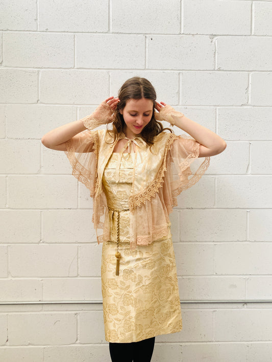 Vintage 1960s Champagne Gold Metallic Floral Embroidered Silk Pencil Skirt, W24"