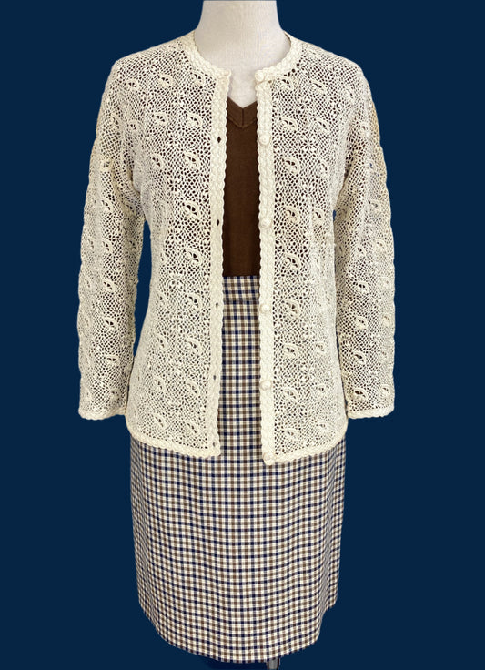 Vintage 1960s Cream Cotton Irish Crochet Lace Cardigan, XS
