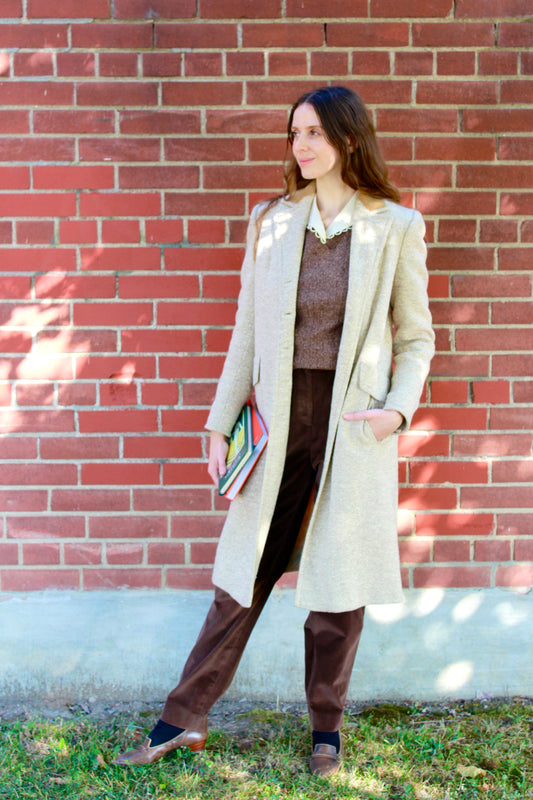 We imagined what the palette would be like in full colour. We chose muted and earthy tones of cream, oatmeal, grey, navy, brown, tan, beige, light yellow and hints of white. These items have an array of different textures from crochet cotton to bouclé wool, linen, polyester and cashmere. We took some creative license as not all the pieces are from the 60s; we pulled a few from other eras to style it all together. We hope you enjoy our picks!