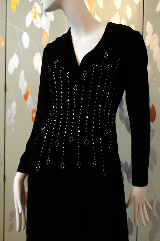 Vintage 1990s Oscar De La Renta Black Velvet Bedazzled Long Sleeve Evening Dress, S/M