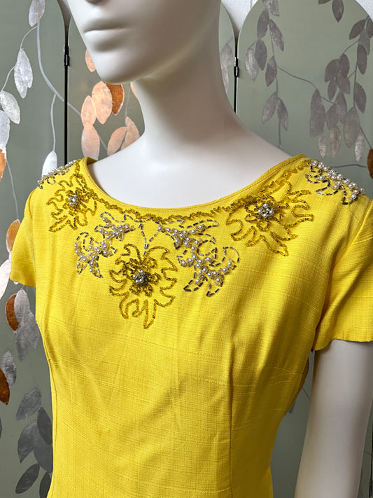 Vintage 1960s Canary Yellow Beaded Dress and Jacket Set, Large
