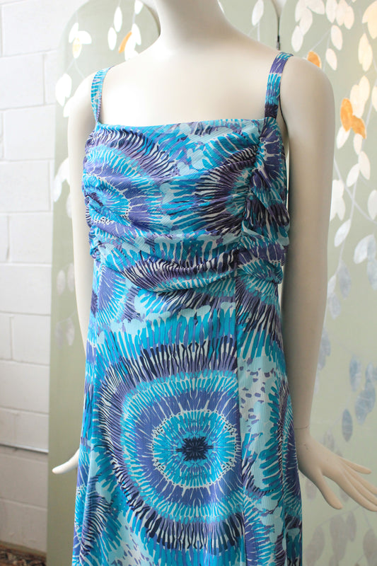 Vintage Early 2000s Blue Tie Dye Circle Pattern Wedding Guest Dress, XL