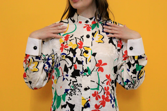 Vintage 1980s White Floral Print Long Sleeve Silk Mini Shirt Dress
