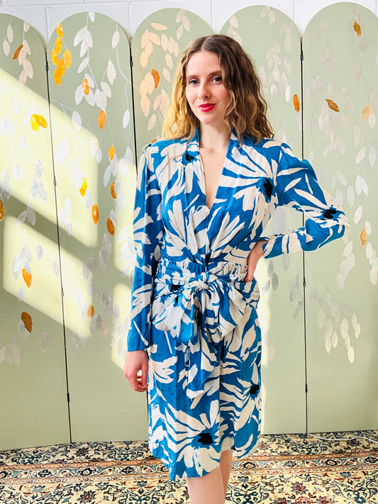 Vintage 1980s Blue and White Floral Silk Long Sleeve Cocktail Dress, Small