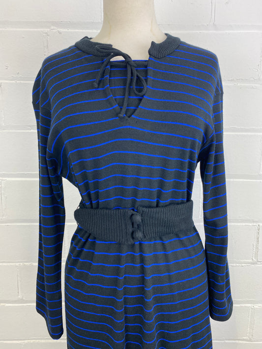 Vintage 1980s Long Sleeve Striped Knit Dress, Black and Blue, Large