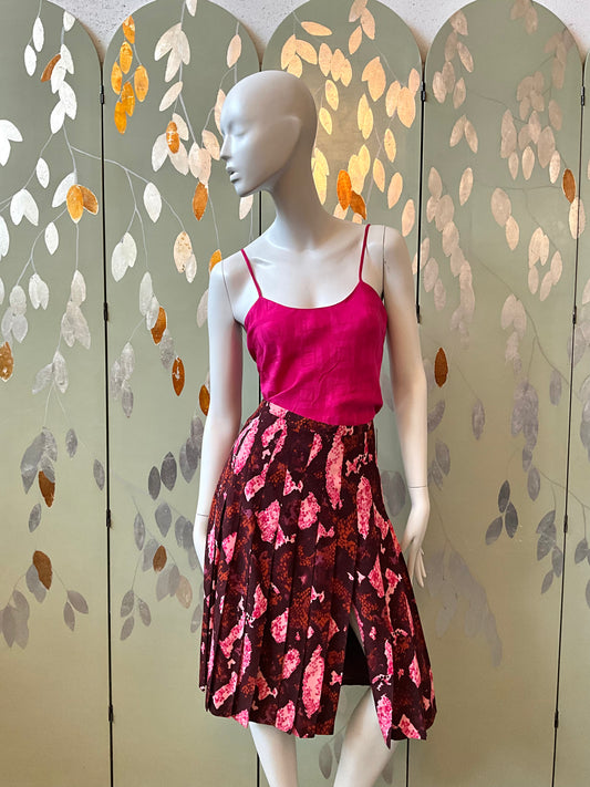Vintage 2000s Rena Lange Pink and Burgundy Print Pleated Silk Midi Skirt, XL