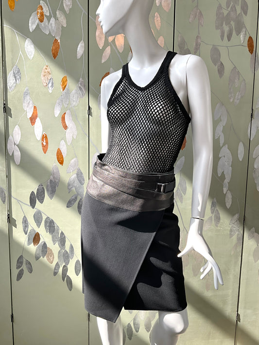 Donna Karan Black Asymmetrical Wool Skirt with Leather Waist and Belt