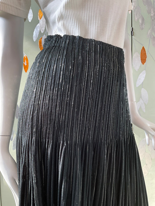 Vintage 1990s Issey Miyake Black and Silver Metallic Pleated Midi Skirt, Medium