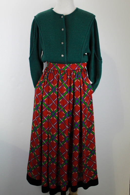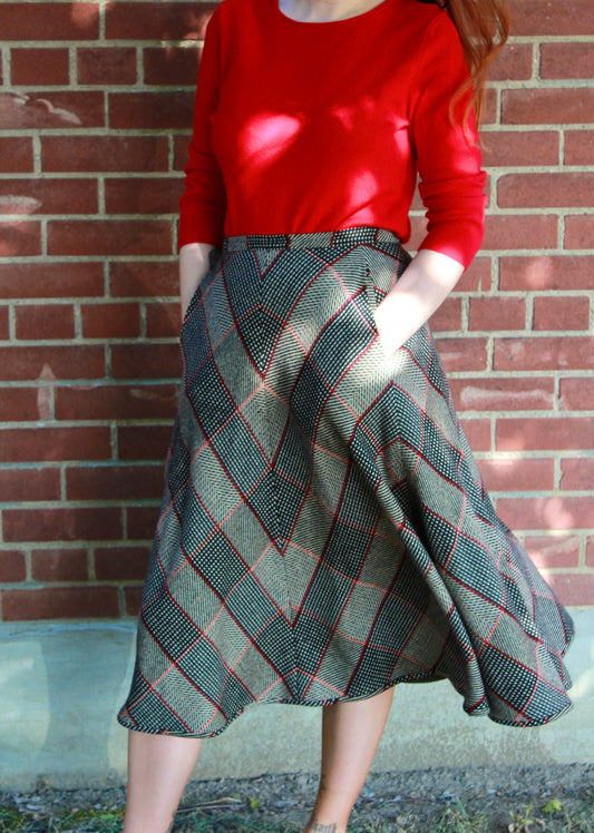 Vintage 1980s Valentino Wool Chevron Plaid Flared Midi Skirt, W30