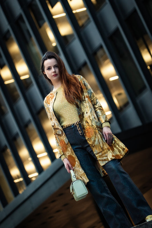 Vintage 1970s Bill Blass Metallic Gold Abstract Coat Dress, Medium