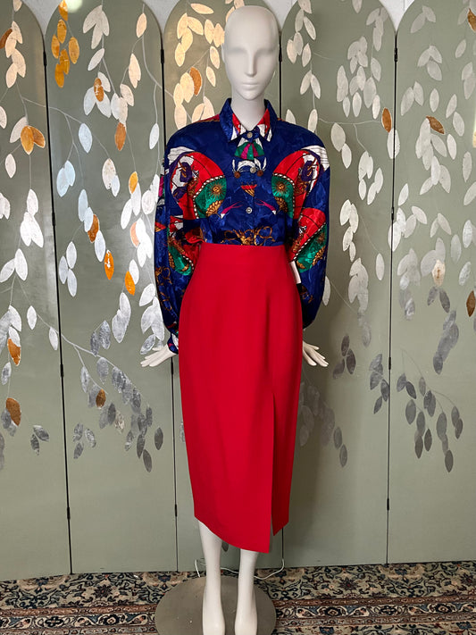 Vintage 1990s Red Midi Pencil Skirt with Slit, Small