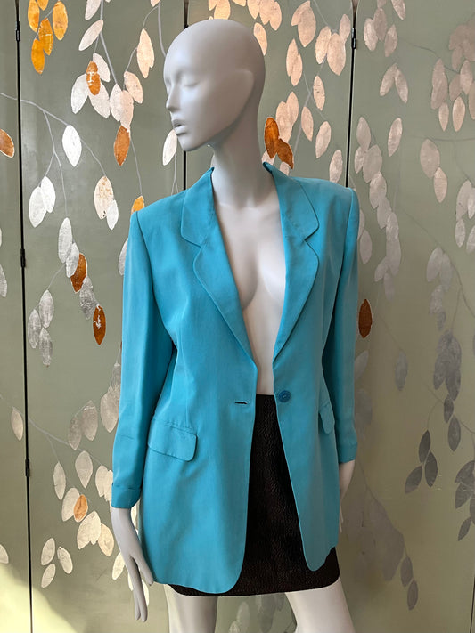 Vintage 1980s Baby Blue Silk Long Blazer, Small