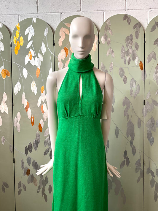 Vintage 1970s Green Wool Halter Neck Maxi Dress, S-M