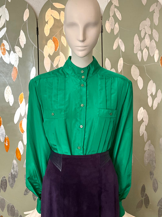 Vintage 1980s Shamrock Green Satin Pleated Bomber Style Blouse, Large