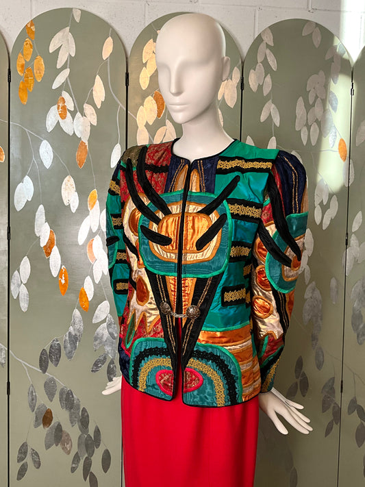 Vintage 1980s Maximalist Green and Gold Wearable Art Patchwork Jacket by Judith Roberto, Medium