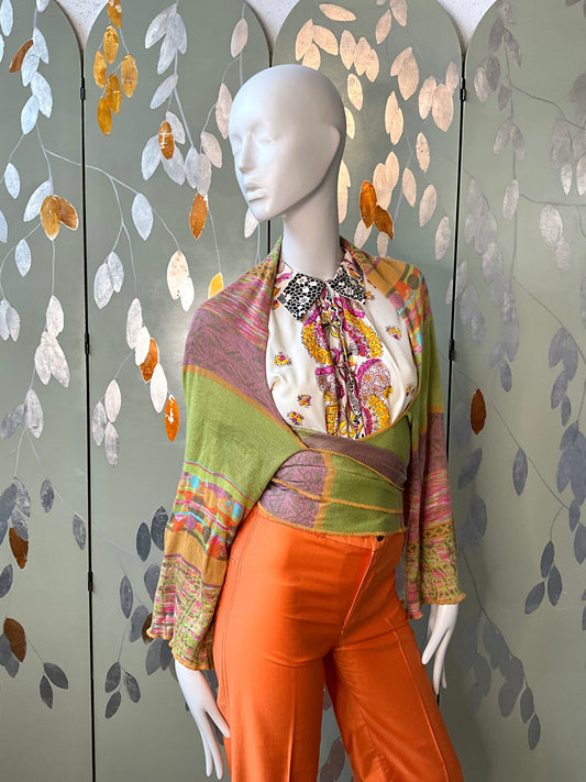 Vintage 2000s Multicolour Patterned Wide Sleeve Wrap Cardigan with Waist Ties