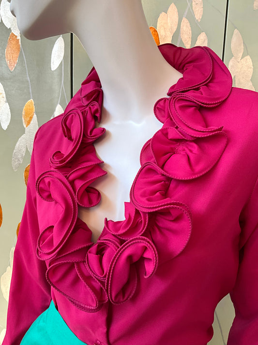 Vintage 1980s Pink Long Sleeve Ruffle Neck Blouse, Med-Lrg