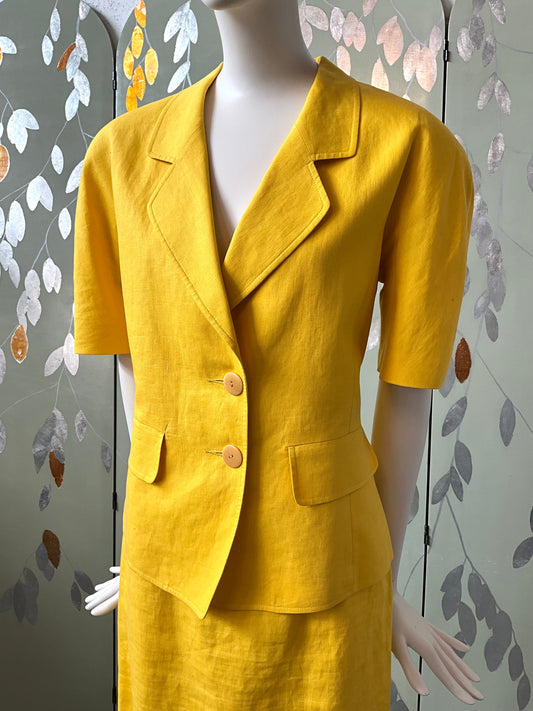 Vintage 1980s Canary Yellow Short Sleeve Linen Skirt Suit, Medium