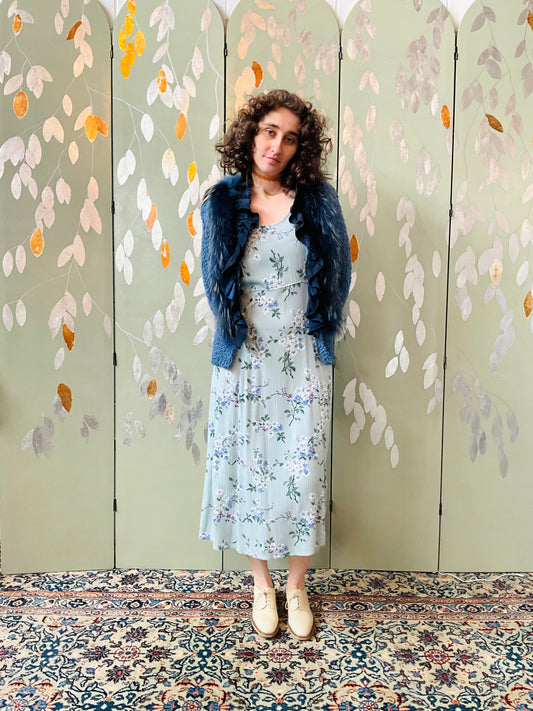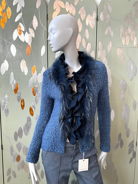 Vintage 2000s Blue Knit Cardigan with Faux Fur Ruffle Trim, Medium