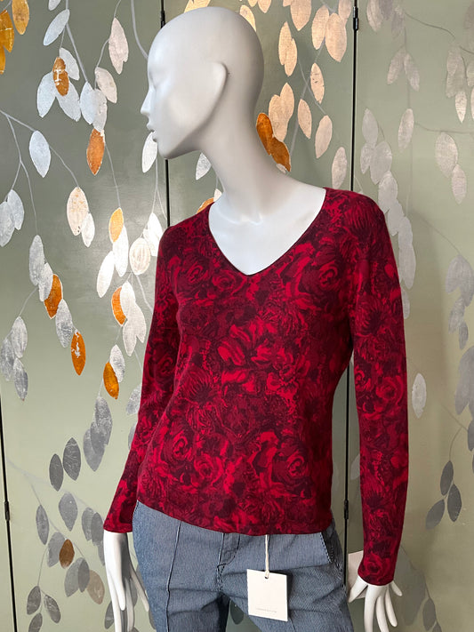 Vintage 1990s Red Rose Print V Neck Cashmere Top, Large
