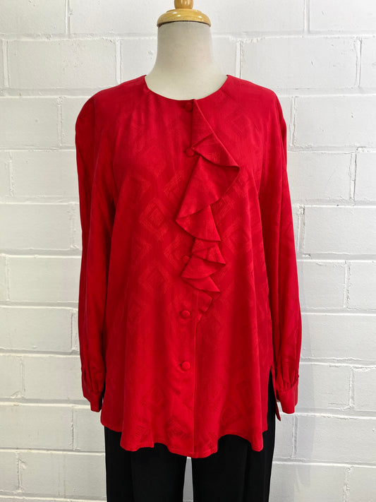 Vintage 1980s Deadstock Red Silk Long Sleeve Ruffle Blouse