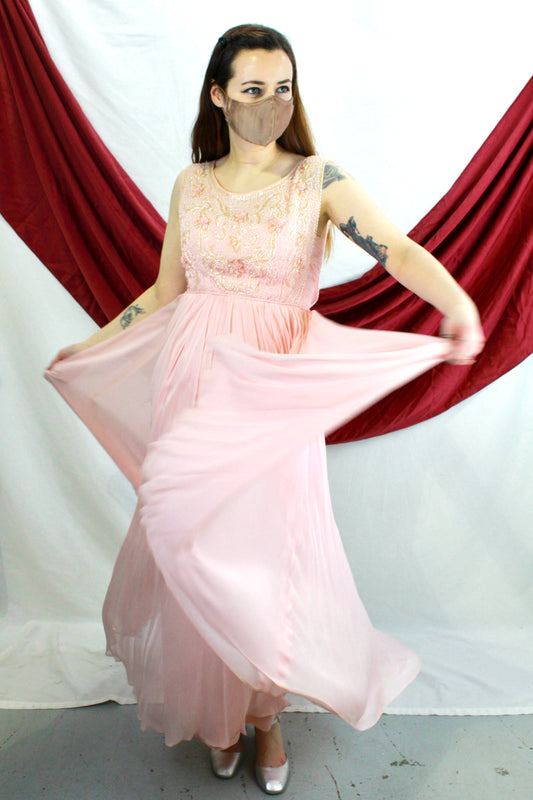 Vintage 1950s Pink Nightgown with Sheer Ribbed Lace Bodice and Self Belt, Small