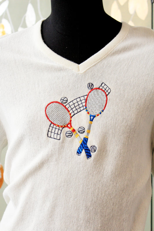 Vintage 1970s White Tennis V Neck Mens Long Sleeve Sweater, Medium
