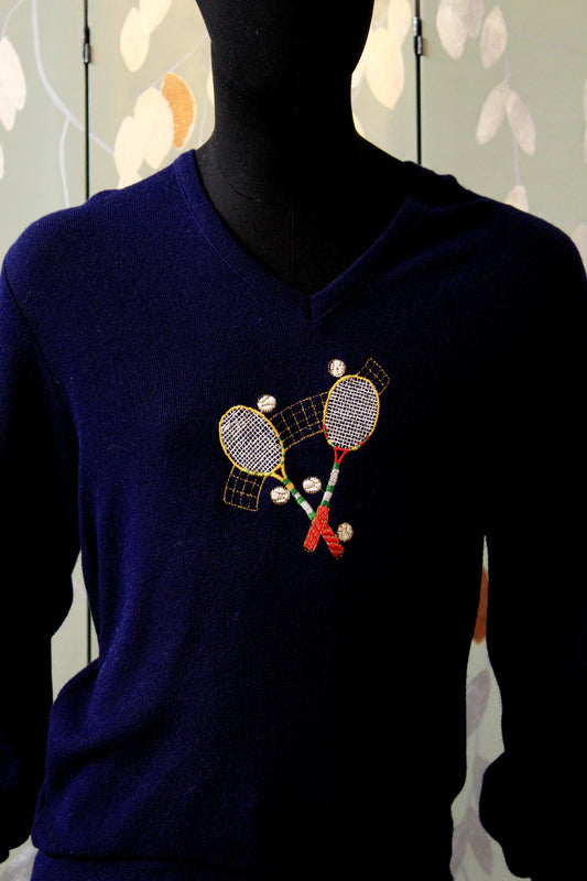 Vintage 1970s Navy Blue Tennis V Neck Mens Long Sleeve Sweater, Medium