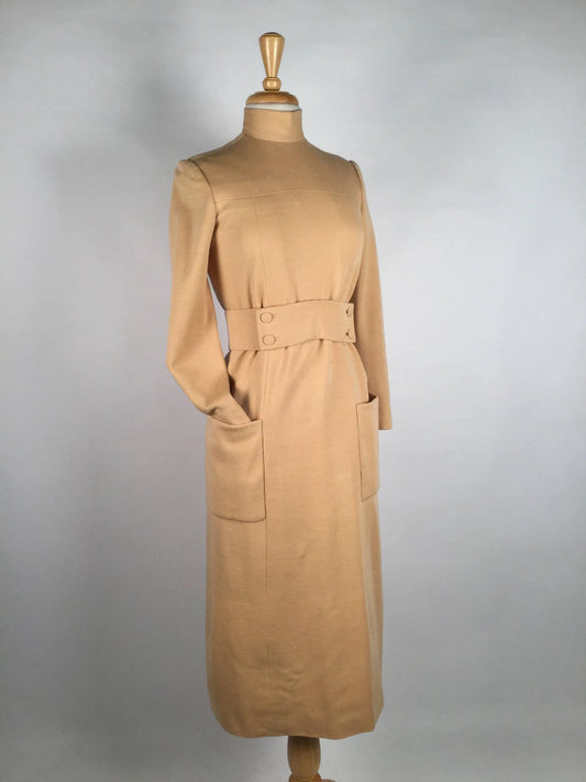 Vintage 1970s Norman Norell Designer Camel Stand Collar Wool Day Dress, Med