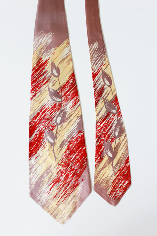 Vintage 1950s Abstract Tulip Floral Print Tie In Pale Rose/Red/Yellow