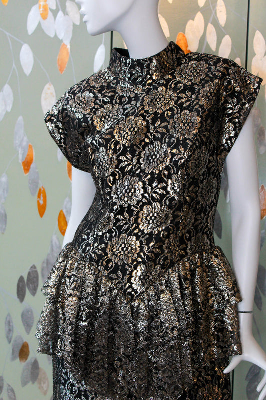 Vintage 1980s Black and Gold Metallic Rose Lace Peplum Dress, Large