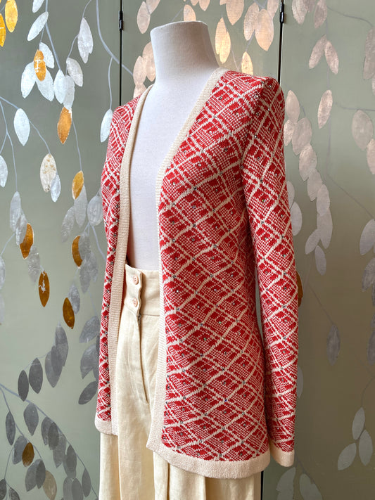 Vintage 1970s Adolfo Red and Cream Rhinestone Cardigan, Small