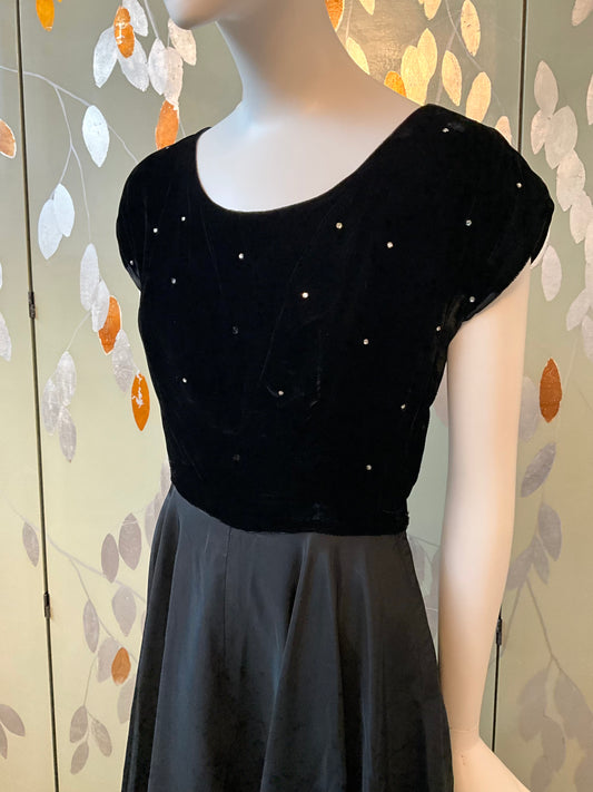 Vintage 1950s Black Velvet Rhinestone Cocktail Dress, Small