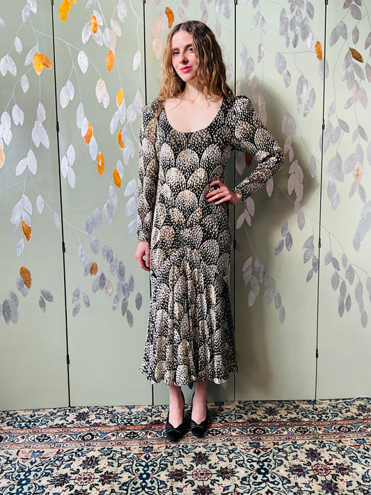 Vintage 1980s Stavropoulos Eyelash Metallic Dot Print Dress With Fishtail, Small
