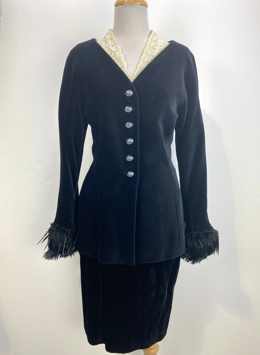 Vintage 1980s Women's Black Velvet Feather Trim Jacket, Myréne De PréMonville, Medium