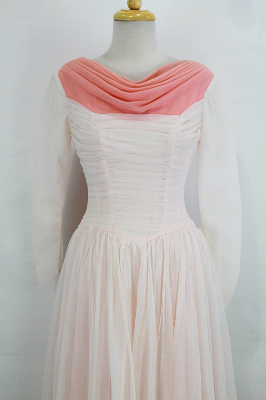 Vintage 1950s Pale Pink Party/Prom Dress with Contrast Coral Train, XS